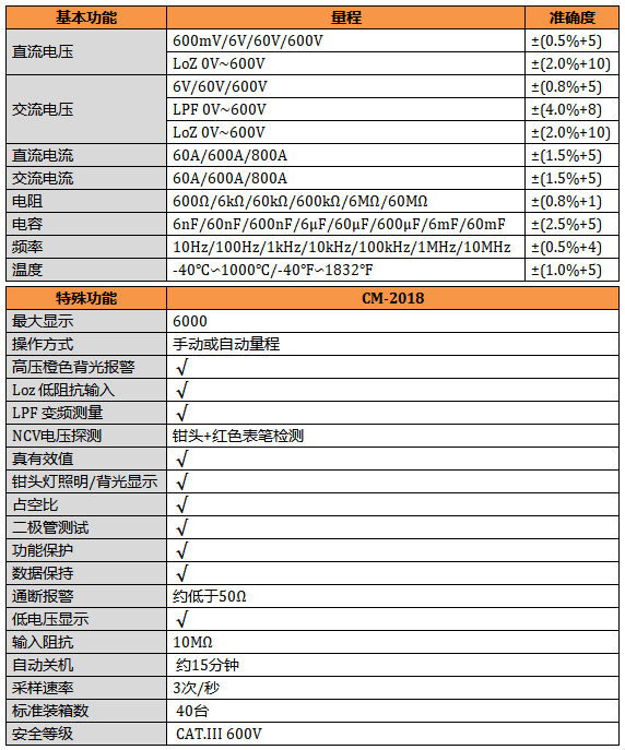 CM-2018 交直流800A真有效值测量, LoZ 低阻抗电压测量,LPF 低通滤波变频测量,NCV功能(钳头|红表笔),电容,频率,温度测量,背光显示,钳头照明