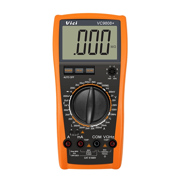VC9808+ multimeter, available to DC voltage, AC voltage, DC current, AC current, Resistance, Capacitance, Inductance, Frequency, Temperature, hFE, Diode and Continuity tests; Designed with unit symbol, peak value hold, auto power off and protect function for error operation.