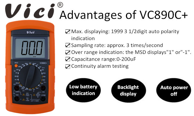 VC835B multimeter, available to DC voltage, AC voltage, DC current, AC current, Resistance, Capacitance, Frequency, Non-contact voltage (NCV) detecting, Duty-cycle, Temperature, Diode and Continuity tests; Designed with unit symbol, Torch lighting, Data hold, Auto ranging switch, Auto power off and alarm functions.