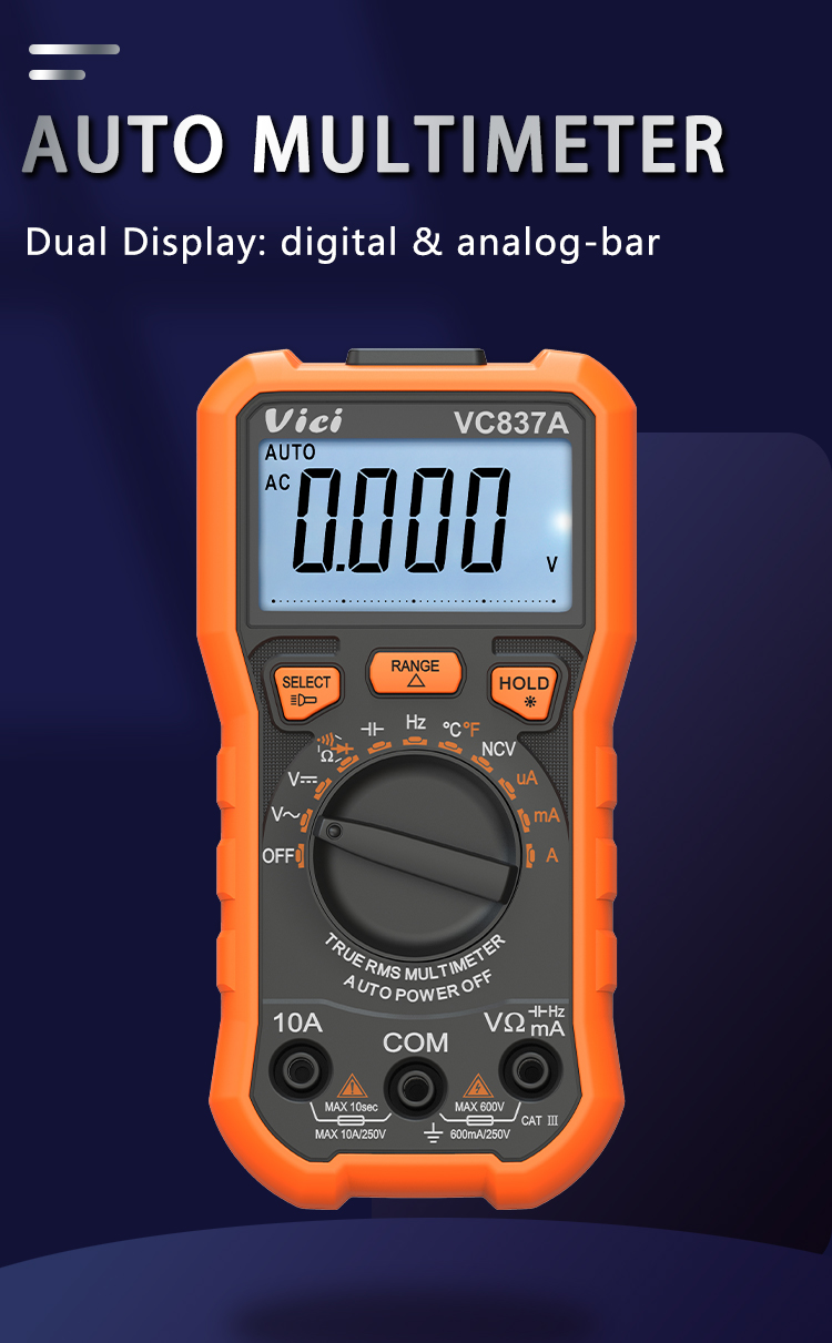 VC837A multimeter, available to DC voltage, AC voltage, DC current, AC current, Resistance, Capacitance, Frequency, Non-contact voltage detecting, Duty-cycle, Temperature, Diode and Continuity tests; Designed with unit symbol, backlight display, analog bar display, torch lighting, data hold, auto ranging switch, auto power off and alarm functions.