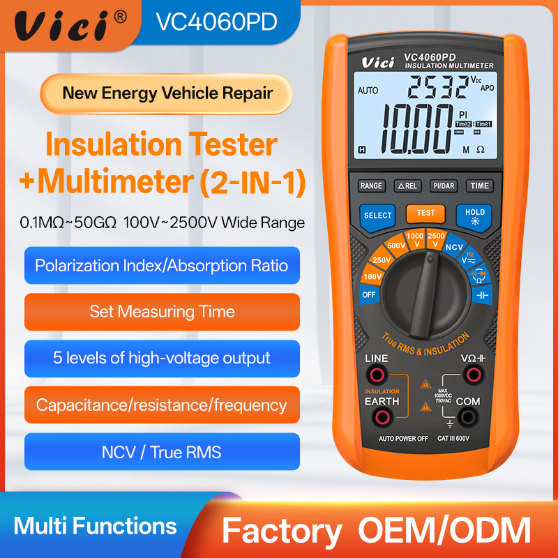 VC4060PD Insulation + Multimeter, 100V/2GΩ-2500V/50GΩ, PI/DAR, True RMS test, NCV test, Data hold, Backlight, Torch lighting functions.