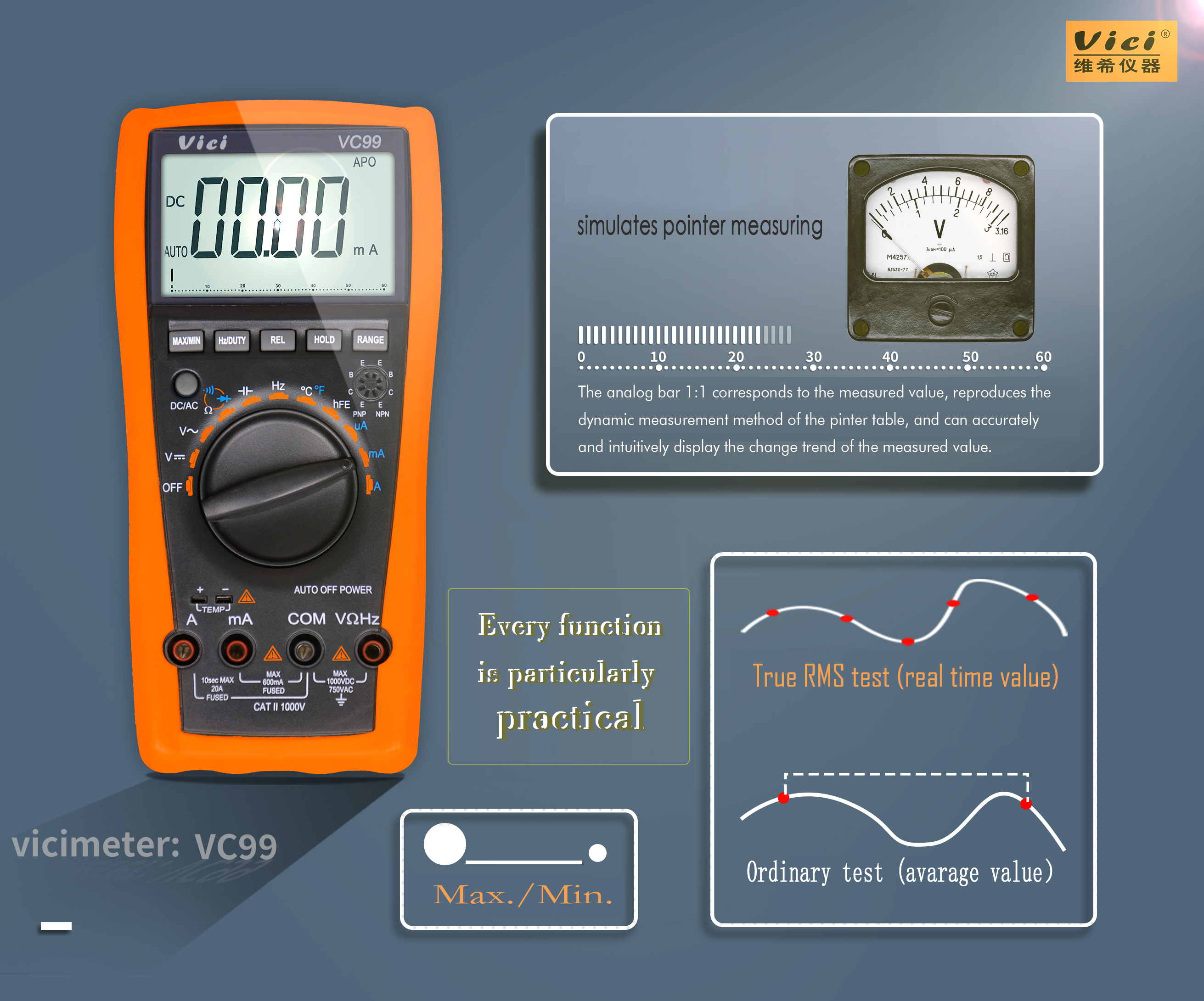 VC99 True RMS, Analog bar display, NCV test, Max/Min , Data hold, Backlight.