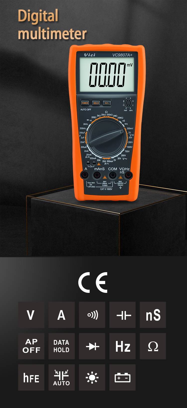 VC9807A+ multimeter, available to DC voltage, AC voltage, DC current, AC current, resistance, capacitance, conductance, frequency, hFE, diode and continuity tests; Designed with unit symbol and backlight display, data hold, auto power off and mis-operation protection functions.