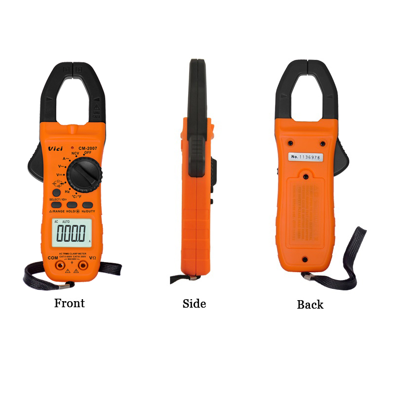 CM-2007 clamp meter, available to DC voltage, AC voltage, AC current, resistance, capacitance, frequency, non-contact voltage, temperature, diode and continuity tests; Designed with unit symbol and backlight display, data hold, clamp lighting, auto ranging switch, auto power and alarm functions.