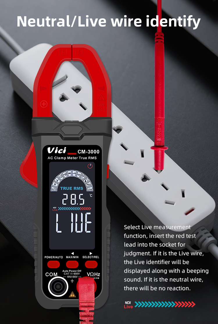 CM-3000 smart clamp meter, available to DC voltage, AC voltage, AC current, resistance, capacitance, frequency, non-contact voltage, temperature, Live, diode and continuity tests; Designed with unit symbol and backlight display, data hold, clamp lighting, auto ranging switch, auto power off and alarm functions.