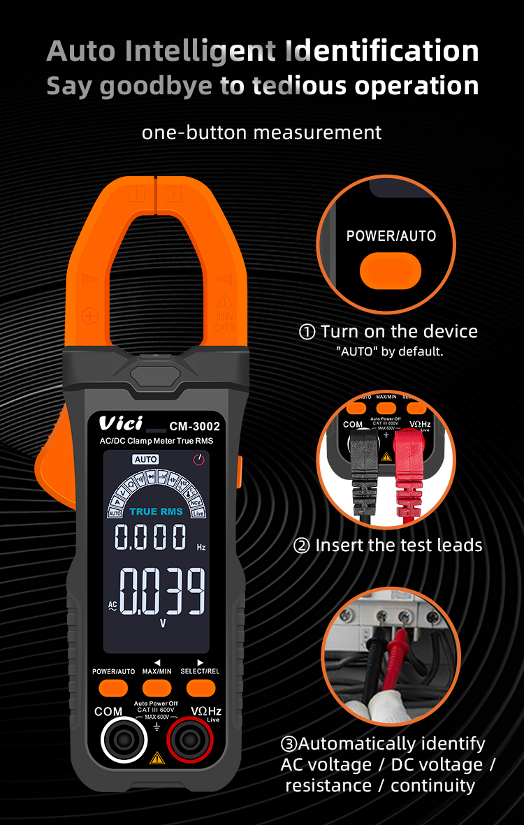 CM-3002 smart clamp meter, available to DC voltage, AC voltage, DC current, AC current, resistance, capacitance, frequency, non-contact voltage, temperature, Live, diode and continuity tests; Designed with unit symbol and backlight display, data hold, clamp lighting, auto ranging switch, auto power off and alarm functions.