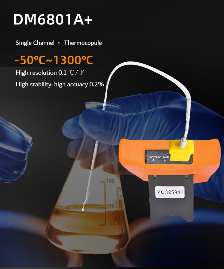 DM6801A+ thermometer, designed with single channel temperature measurement, precise readings to 0.1°C makes measurements more accurate; Available to all kinds of food, solid and liquid object temperature measurement, cold chain, storage, heating devices, equipment surface temperature measurement.