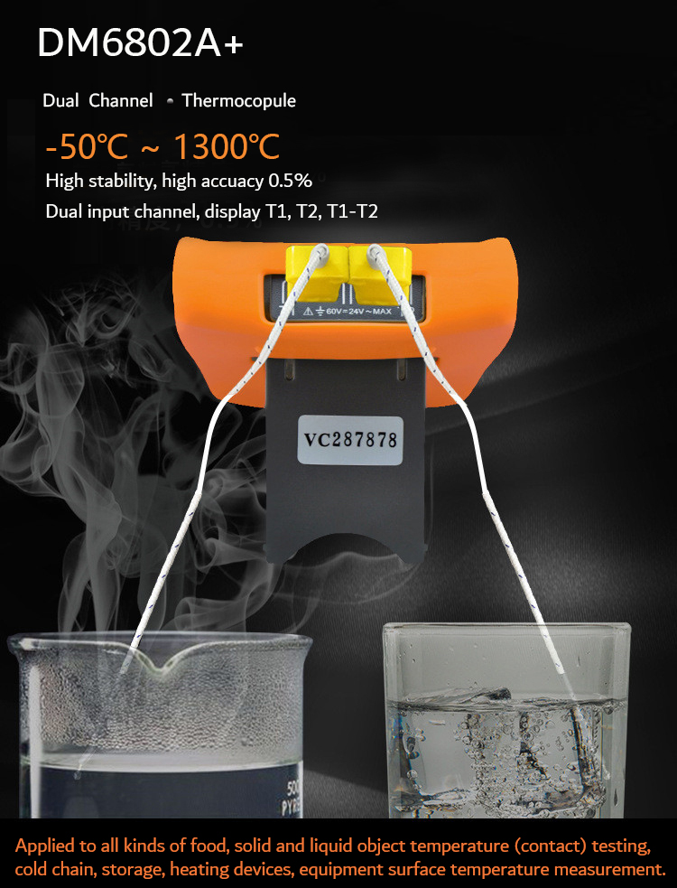 DM6802A+ thermometer, adopts dual channel temperature measurement thermometer, avaialble to measure the temperature of two different points alone or at the same time, and can detect the temperature difference between different points in real time; mainly applied to all kinds of food, solid and liquid object temperature measurement, cold chain, storage, heating devices, equipment surface temperature measurement.