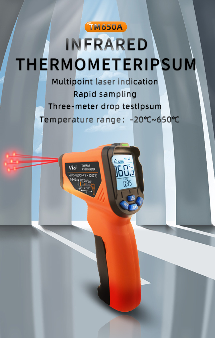 TM650A infrared thermometer, accurately measure the fixed point temperature of dangerous scenes or unreachable objects from a distance. It can measure water temperature, oil temperature, kitchen baking, boiler, smelting, kiln and other temperatures, testing range is -20℃~650℃  / 4℉~1202℉