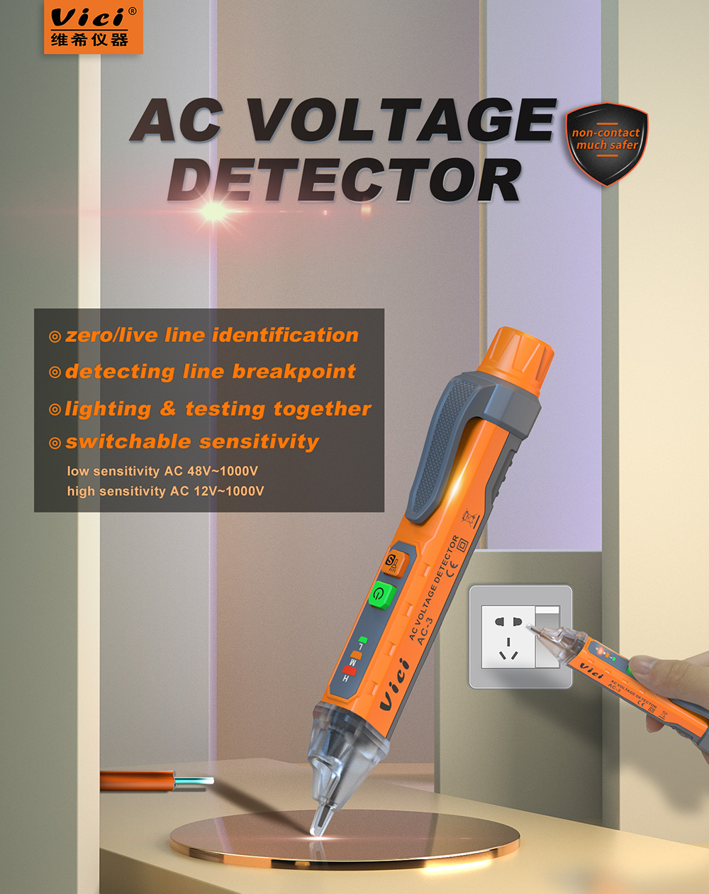 AC-3 switchable sensitivity 12V-1000V 48V-1000V AC live wire testing voltage Detector with sound & Light alarm