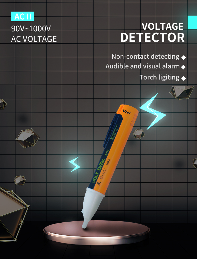 AC II voltage detector, adopts the fully insulated design of the shell, to detect whether there exists AC voltage when the tester is close to the measured conductor, so as to prevent the high voltage from endangering the personal safety of the operator; designed with audible and visual alarm in the presence of high pressure, also the torch lighting function is convenient in dark environments.