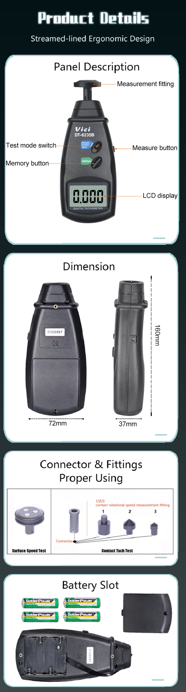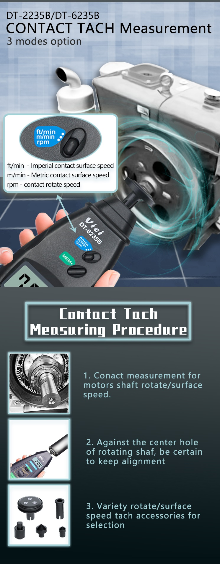 DT-6235B contact rpm digital tachometer is used for speed testing of rotors such as various engines, motors, speed control devices and wire speed tests of various conveyor belts. It is used in the speed debugging of various devices such as aircraft, ships, EMUs, automobiles, model aircraft, toys, etc., and the surface speed debugging of assembly lines and transmission dials.