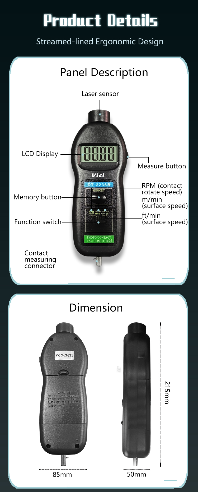 DT-2236B non-contact photo and contact rpm digital tachometer is mainly used for touchless speed testing of rotors such as various engines, motors, speed control devices and wire speed tests of various conveyor belts. It is used in the speed debugging of various devices such as aircraft, ships, EMUs, automobiles, model aircraft, toys, etc.; and the surface speed debugging of assembly lines and transmission dials.
