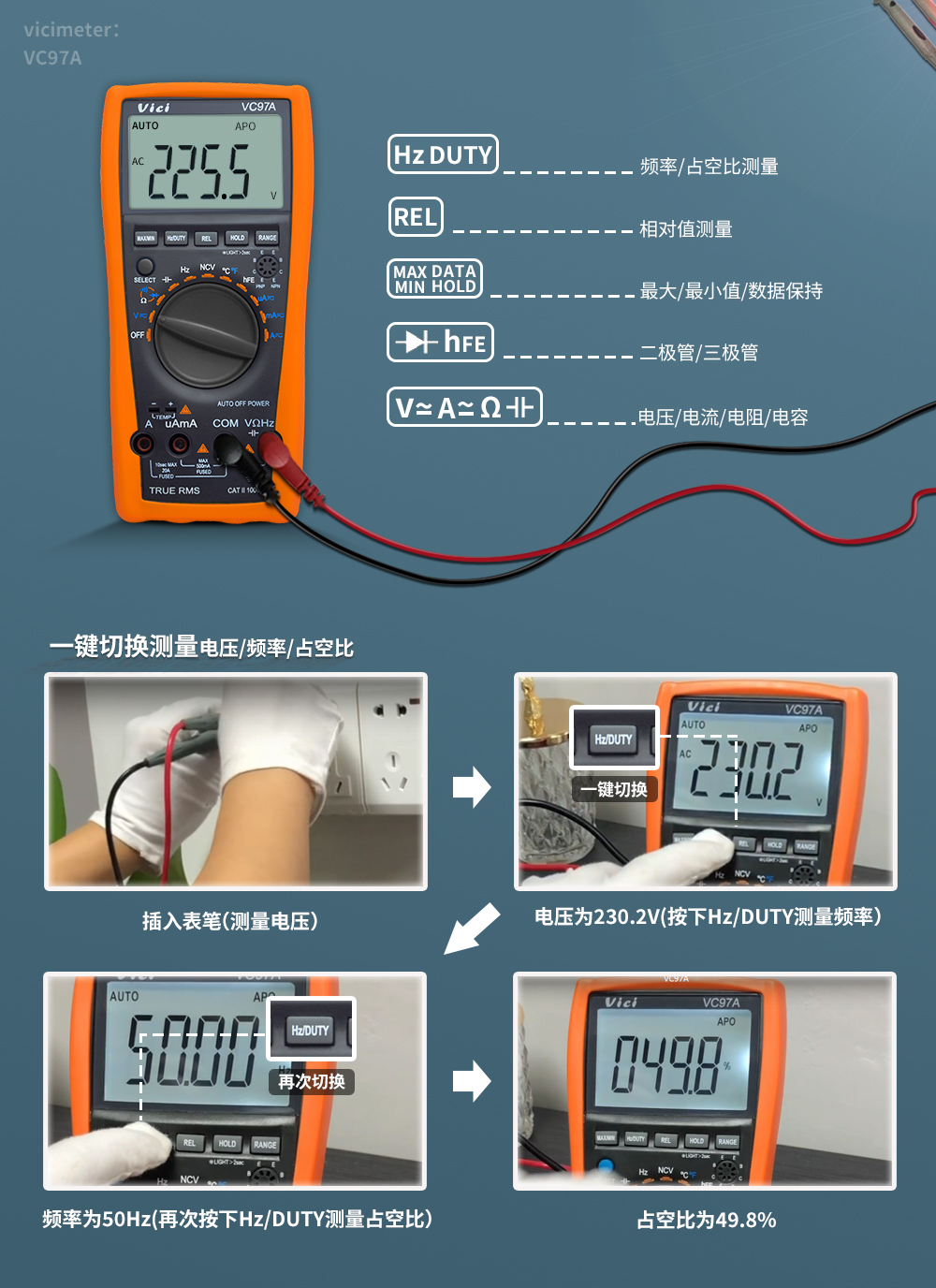 可用来测量直流电压、交流电压、直流电流、交流电流、电阻、电容、频率、非接触电压探测、占空比、温度、二极管及通断测试;同时还设计有单位符号显示和最大值、最小值测量,数据保持、自动量程转换、自动断电及报警功能。