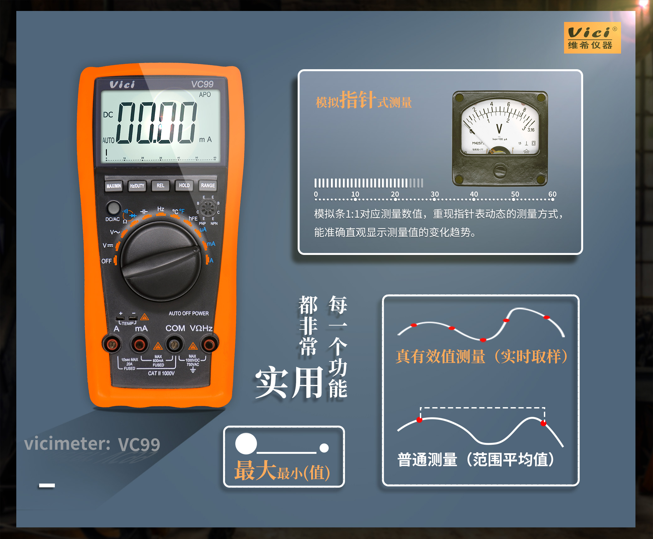 VC99 真有效值测量,模拟条显示,NCV测量,最大值、最小值测量,读数保持,背光显示。