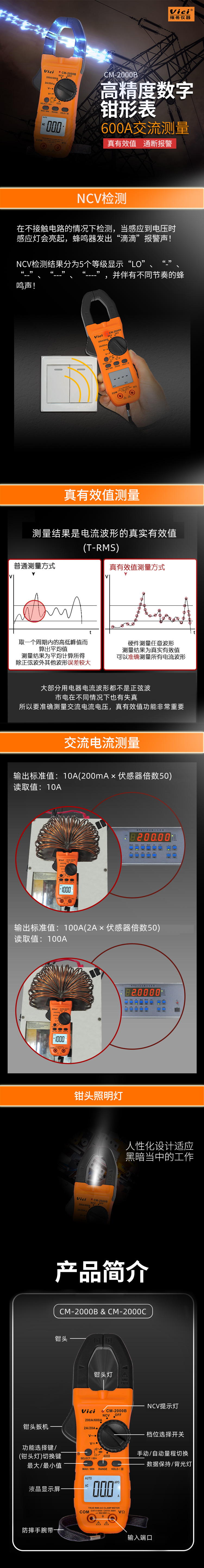 CM-2000B 钳口张开28mm,800A真有效值测量,NCV功能,电池测量,背光显示,钳头照明。