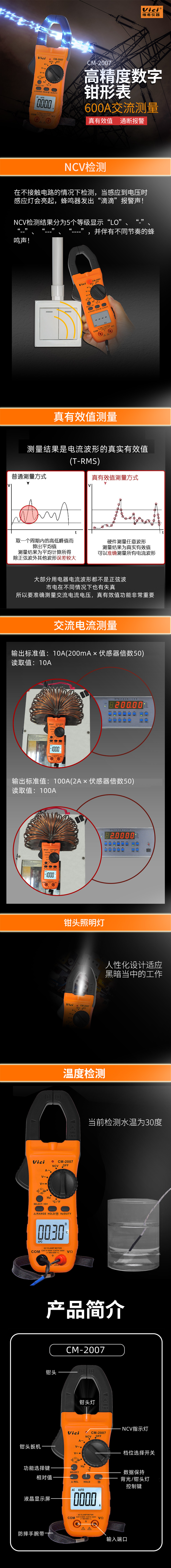 CM-2007 钳口张开28mm,800A真有效值测量,电容,频率,温度测量,NCV功能,背光显示,钳头照明。