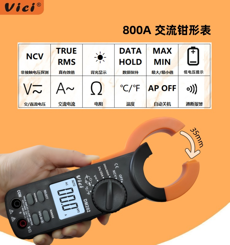 DM202 钳口张开35mm,真有效值测量,NCV功能,温度测量,背光显示。