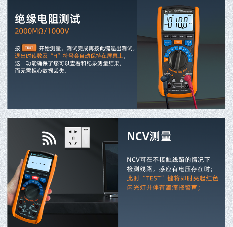 VC4060A 马达检测,绝缘电阻测试仪 真有效值测量, NCV测量,读数保持,背光显示,最大值/最小值及最大值和最小值之间的差值