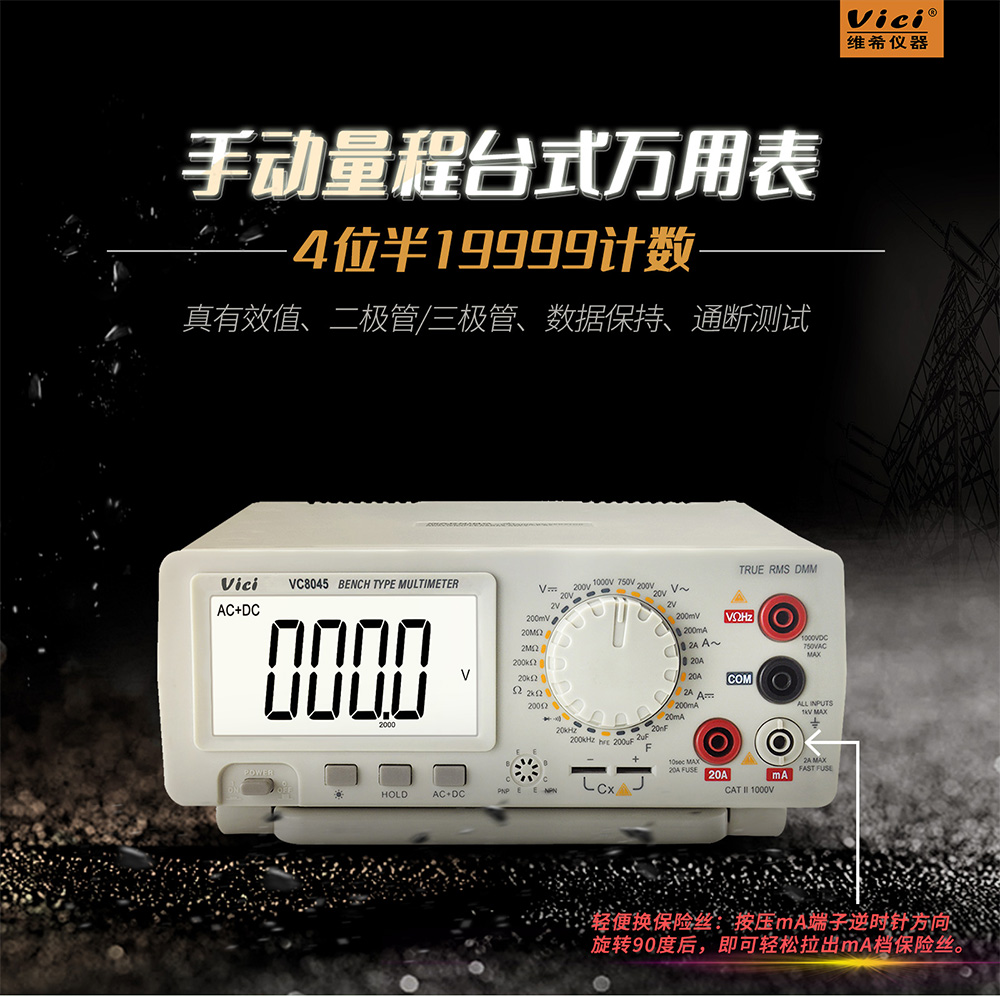 VC8045 高精度台式数字万用表,真有效值测量,AC+DC测量功能,背光功能。