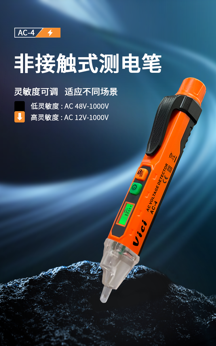 AC-4 LCD感应测电笔,高低灵敏度选择,声光报警,零火线识别,断点检测,手电筒照明,自动关机