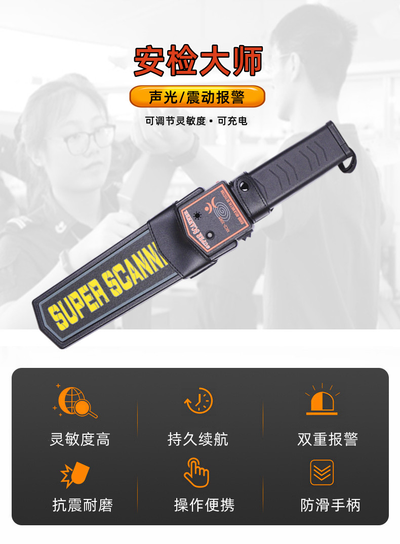 产品用于机场、车站、会场、商场、工厂各种场合的安全防控、防盗。靠近被测物体或人带有金属时会立即发出声光、震动报警,可及时排除隐患及安保防护。