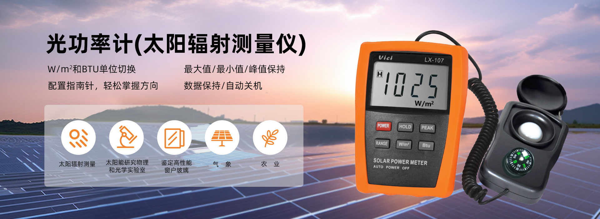 LX-107 太阳能辐射仪(光功率计),W/m² 和 BTU单位显示,最大值,最小值,数据保持功能。
