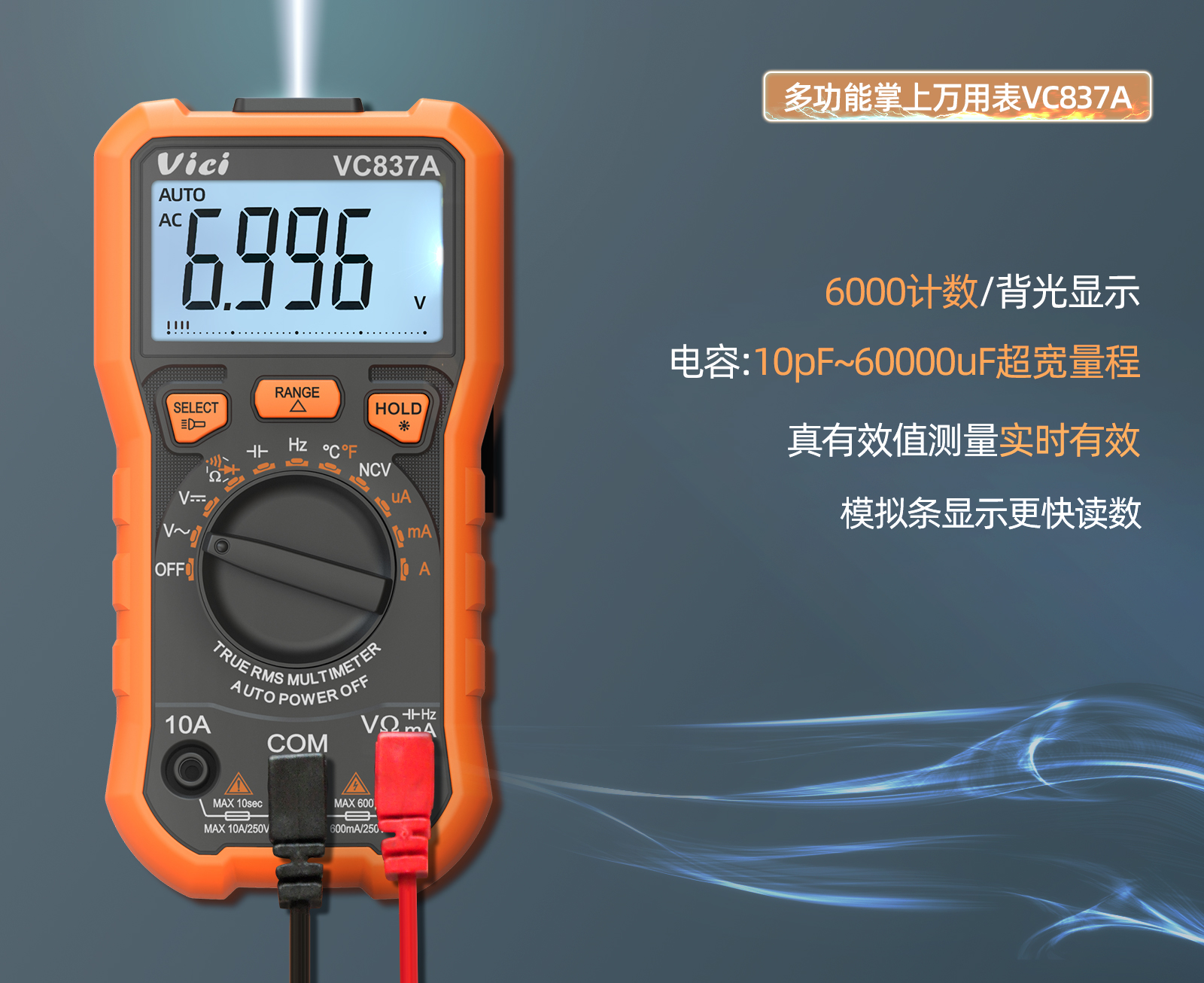 VC837A 真有效值测量,模拟条显示,NCV测量,读数保持,背光显示,照明功能。